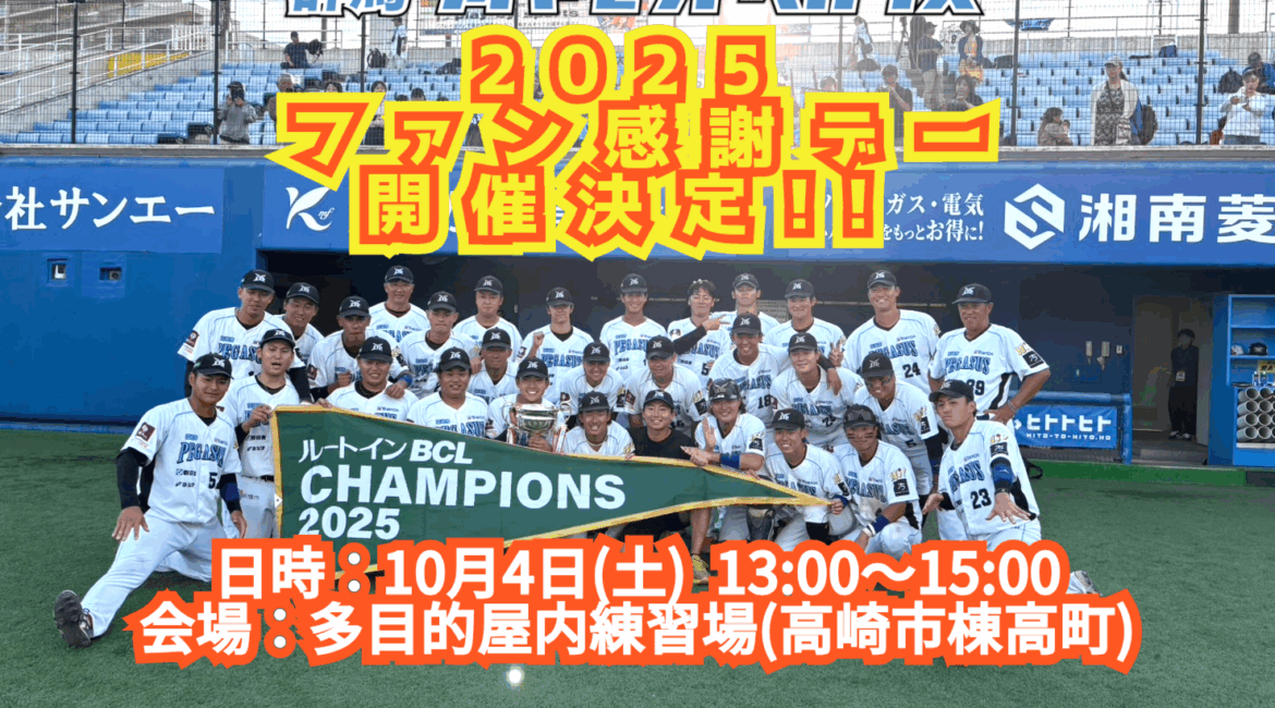 日頃より、群馬ダイヤモンドペガサスを熱く応援いただきまして、誠にありがとうございます。下記のとおり、2025ファン感謝デーを開催いたしますのでお知らせいたします。